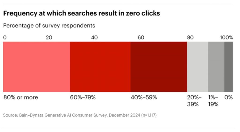 Now, enter the “zero-click” era. As Bain explains in “Goodbye Clicks, Hello AI,” AI-powered search engines and generative AI summaries are becoming the norm. Instead of clicking through to a website, users see answers right on the SERP. That’s what zero-click means: no click required.